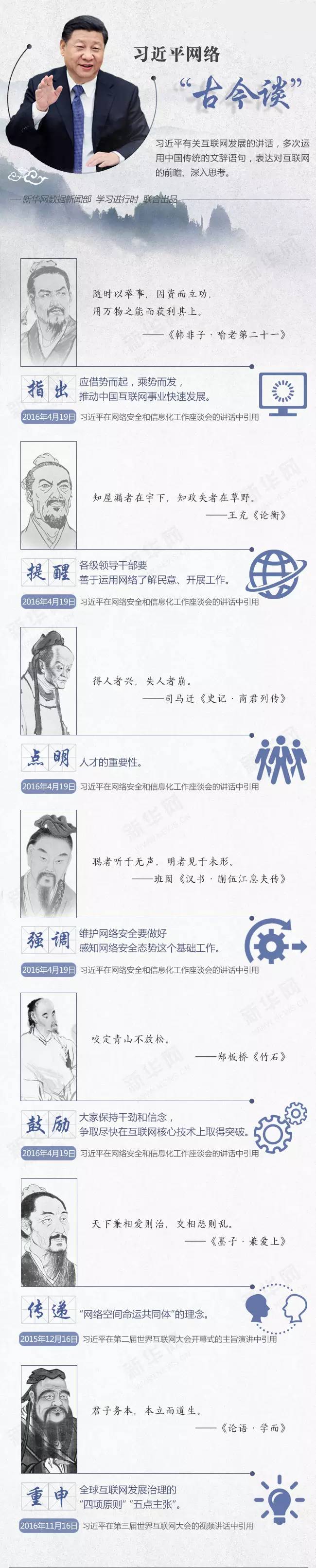 【学习进行时】习近平总书记博古通今,古籍中的名言警句,常常信手拈来,或巧妙化用,或引申阐发,用以指导当前的工作。新华社《学习进行时》原创品牌栏目“讲习所”今天推出文章,与您一起品味总书记借古老的文辞,巧妙表达对互联网发展的深切思考。 互联网与古诗文,居于时间轴的两端,然而古今之理相通。习近平有关互联网发展的讲话,多次运用中国传统的文辞语句,表达对互联网的前瞻、深入思考。古老与新潮,穿越时空的碰撞,淬炼出智慧的火花。