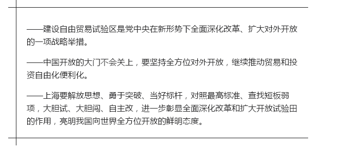 细心观察就会发现,习近平在参加代表团审议时谈到的话题,都与各代表团特点密切相关。总书记为何每到上海团就谈开放,要从上海的城市特点和发展定位说起。 地处长江入海口的上海,是我国首批沿海开放城市之一。上海之所以快速发展,与其开放优势和开放作为紧密相连。在改革开放进程中,上海一直是世界观察中国对外开放政策的一个重要窗口。 近年来,中央对上海提出了“当好全国改革开放排头兵、创新发展先行者”的明确要求。既是“排头兵”,必然要走在前面、闯出天地。开放之于上海,上海开放之于中国,重要性不言而喻。 2013年9月,我国首个自由贸易试验区在上海揭开面纱。三年多来,以“大胆试、大胆闯、自主改”精神为指引,上海自贸试验区创造了一批可复制可推广的试点经验。