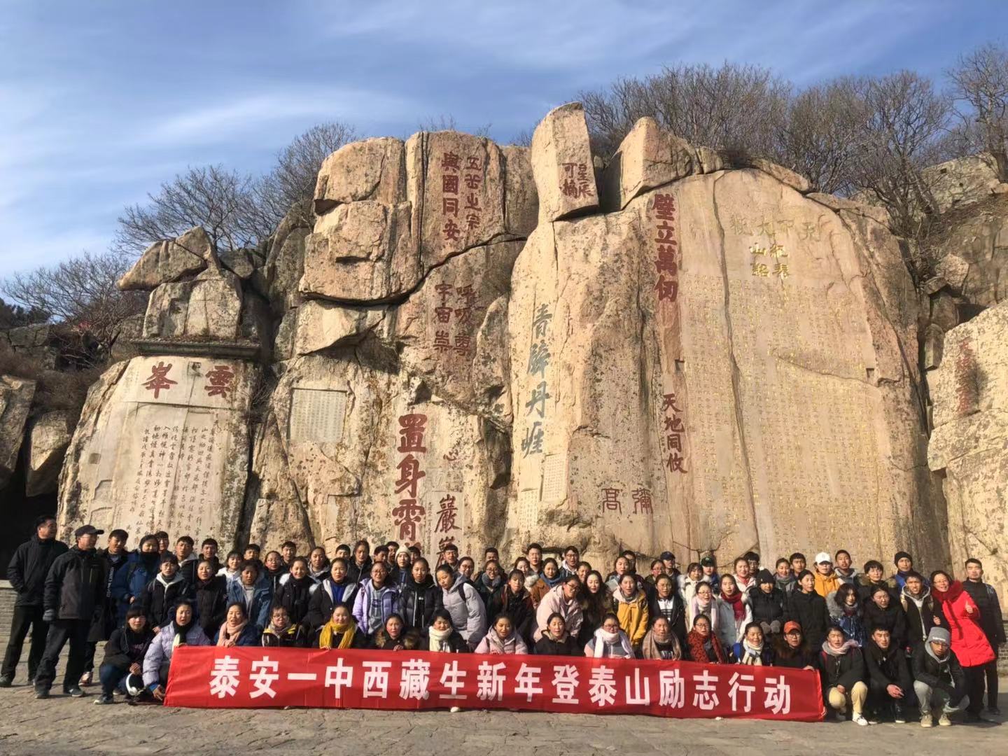 1月1日早上,泰安一中西藏生新一轮的“一山一水一圣人”研学活动——新年登泰山励志行动——正式起航。 本次行程为期一天,120名西藏生迎着新年的第一缕阳光,徒步进行登山,发扬吃苦耐劳、团结协作的精神,了解泰山历史,学习泰山文化。 泰山又名岱山、岱宗,位于山东省中部,隶属于泰安市,绵亘于泰安、济南、淄博三市之间,总面积24200公顷。主峰玉皇顶海拔1545米,气势雄伟磅礴,有“五岳之首”、“五岳之长”、五岳之尊、“天下第一山”之称。是世界自然与文化遗产,世界地质公园,国家AAAAA级旅游景区。它是中华民族的象征,是东方文化的缩影,是中华民族精神的家园。 对于此次泰山之行,孩子们都兴奋极了,老师们也充满了期待。进入景区大门万仙楼处,老师和同学们进行了合影留念,为此次美好行程留下纪念。 ![]() 景区前合影留念 随着泰山行程的开始,同学们很快到达了第一站——斗母宫。斗母宫,是泰山景区中最为幽静的所在,古名“龙泉观”,它临溪而建,分为北、中、南三院,山门面西。钟鼓二楼直接建于宫门两旁并与山门连在一起,来到斗母宫,北看天门依然高挂,遥遥不可及;南望来路,一些低峰矮山却尽在脚下了。兴奋之余的同学们也在此进行了合影留念。 ![]() 同学们在斗母宫前合影留念 参观完斗母宫后,同学们又继续开始攀登泰山,此时距离泰山的中天门也已行程过半。快看!中间那位穿蓝上衣的同学,在背着自己书包的同时,还在为其他略显疲惫的同学拿起了书包跨在身上继续前行,这种助人为乐的精神值得我们学习,在这寒冷的冬天里送来了丝丝温暖。