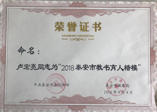 为培育和践行社会主义核心价值观,倡导尊师重教的风尚,增强广大教师教书育人的荣誉感和使命感,市委宣传部、市教育局联合开展了“2018泰安最美教师”评选活动。经过学校推荐、县级评选、市级评审,我校卢宏亮老师获“2018泰安最美教师”称号,同时获得“2018泰安市教书育人楷模”称号。 ![]() ![]()