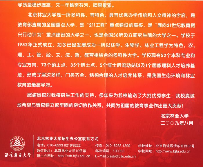 北京林业大学致我校喜报