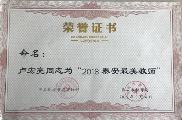 为培育和践行社会主义核心价值观,倡导尊师重教的风尚,增强广大教师教书育人的荣誉感和使命感,市委宣传部、市教育局联合开展了“2018泰安最美教师”评选活动。经过学校推荐、县级评选、市级评审,我校卢宏亮老师获“2018泰安最美教师”称号,同时获得“2018泰安市教书育人楷模”称号。 ![]() ![]()