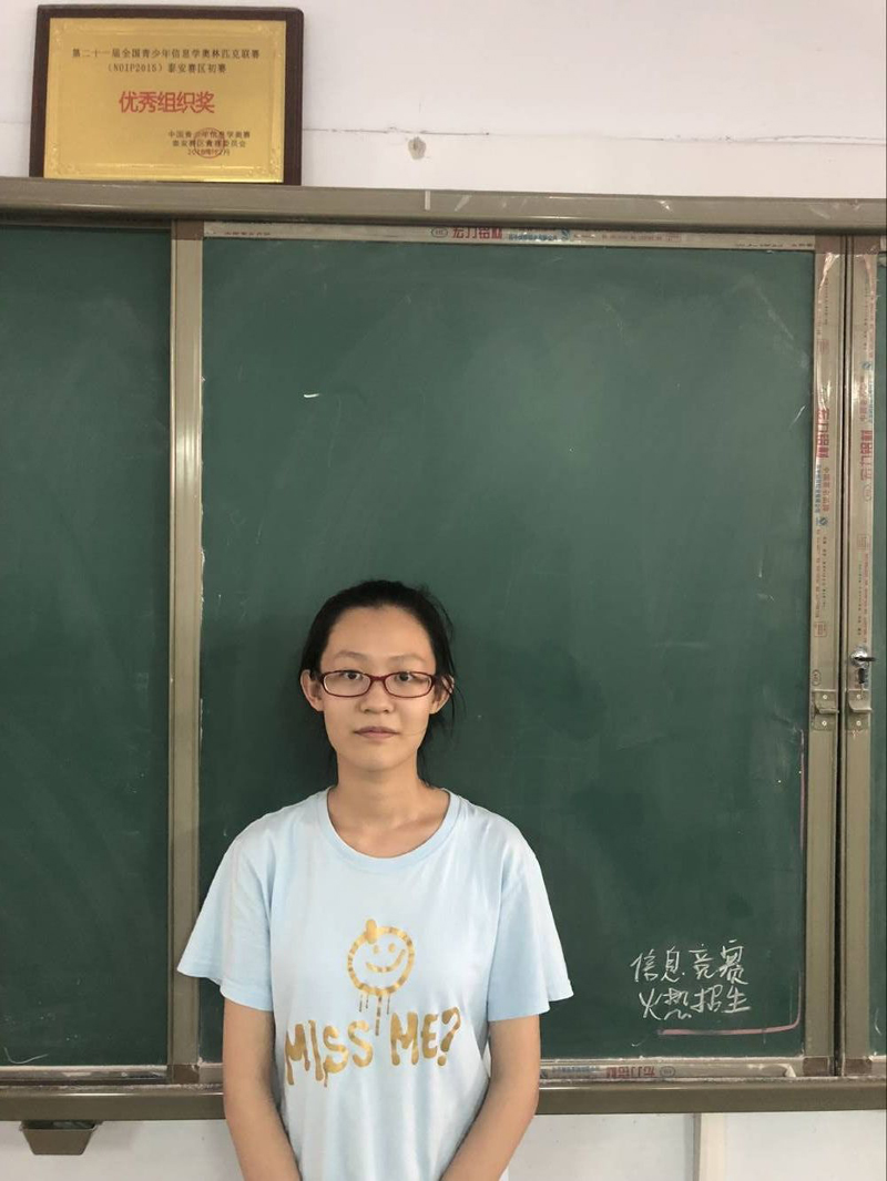 2016级9班,龚傲林。2016年我初赛失利,仅获得市级一等奖,经过一年的努力,经历了各种坎坎坷坷,我有幸在2017年勉强拿到了全国一等奖,两年多的竞赛经历,让我认识了许多强者,同时也意识到了自己的弱小,这使得我不断发愤图强,努力提升自己的实力,争取变得更加强大。