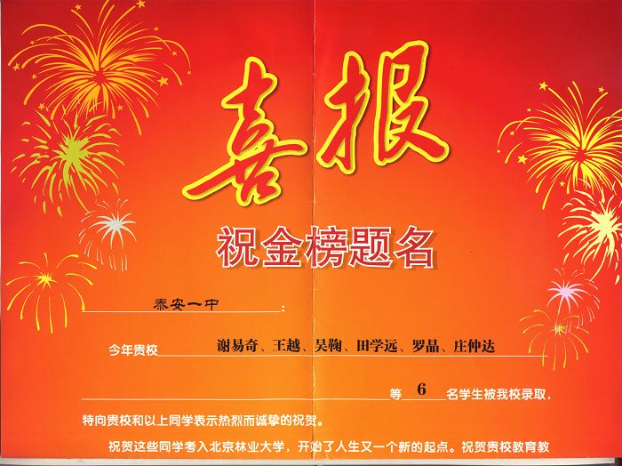 级学生谢易奇、王越、吴鞠、田学远、罗晶、庄仲达等六名同学以优异的成绩被北京林业大学录取。