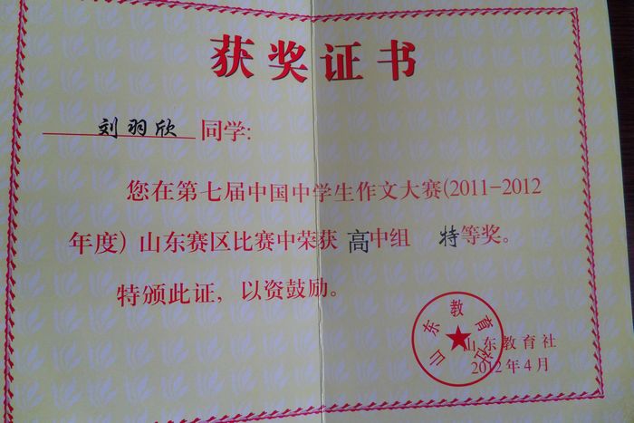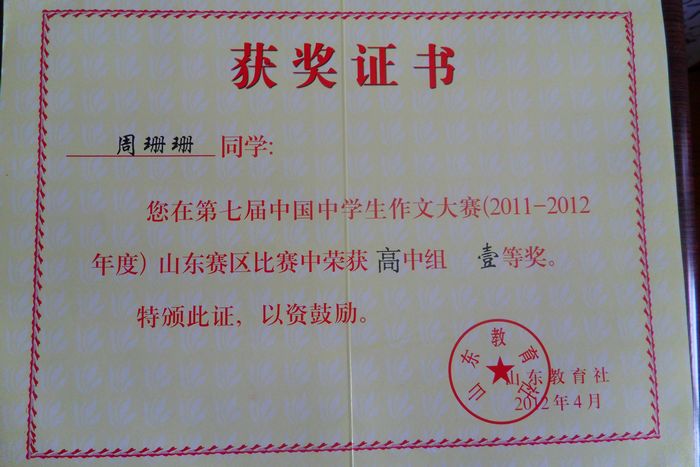 第七届中国中学生作文大赛成绩近日揭晓,我校1名同学获特等奖,1名同学获一等奖,41名同学获二等奖,68名同学获三等奖。学校获得优秀组织奖。 中国中学生作文大赛由团中央中华全国学生联合会办公室、中国作家协会儿童文学委员会、国务院关心下一代工作委员会公益文化中心、教育部中语会、中国少年儿童报刊工作者协会中学报刊专业委员会联合主办,由全国82家中学报刊承办。该赛事目前已成为全国教育界规模最大、规格最高、参与人数最多、影响最广的作文大赛。 具体获奖情况如下: 1.优秀组织奖:泰安一中 2.特等奖(1人):刘羽欣(高一7班,指导老师 赵鲁林) 3.一等奖(1人):周珊珊(高一11班,指导老师 路庆华) 4.二等奖(41人):张明瑞 姬览慧 李嘉艺 赵云路 米 阳 吕榕榕 于婧涵 庞琳琳 陈雅宁 谢泊宁 张 甘 薛 雨 张翰玉 邢 娜 孟静宜 张永超 杨方心 武欣莹 张 晓 张 宁 王广宇 刘粟益 董雪莹 徐文德 邵 堃 刘瑞琦 曹文康 夏新苗 李双君 李 婷 张启迪 游婷婷 吴晓光 赵玉洁 宋晓菲 吴兴玉 周 艺 李彬彬 郭傲洋 张 骋 李 邈 5.三等奖(68人):方小青 尹新悦 宗世一 杨 璐 王文倩 张铭霄 张 赫 袁鲁新 齐淑石 赵若雨 周豪义 赵 彤 聂超辉 王征运 于雪颖 武可 李子曦 关震 侯庆敏 马依然 董悦 王阗光 王良益 孟昭玥 傅晨笛 张军瑶 黄艳华 贺童 姜娅琼 李咏雪 陆洪钰 卢甲 陈小桥 国秀婷 孙 漪 张悦铭 杜宣成 刘亭亭 朗智全 石超杰 李晓玉 刘晓曈 刘松楠 陈 璐 王雪莹 游 迪 杨 瑞 裴童心 亓鸿儒 许 然 毛 毓 宋 贺 翟伽琦 刘 坤 苗东方 张 晴 任 倩 李 邈 赵致远 宋晓妍 范方迪 杨琦 白寿颖 姚 巍 史大隆 法航伟 展 琪 王庆富
